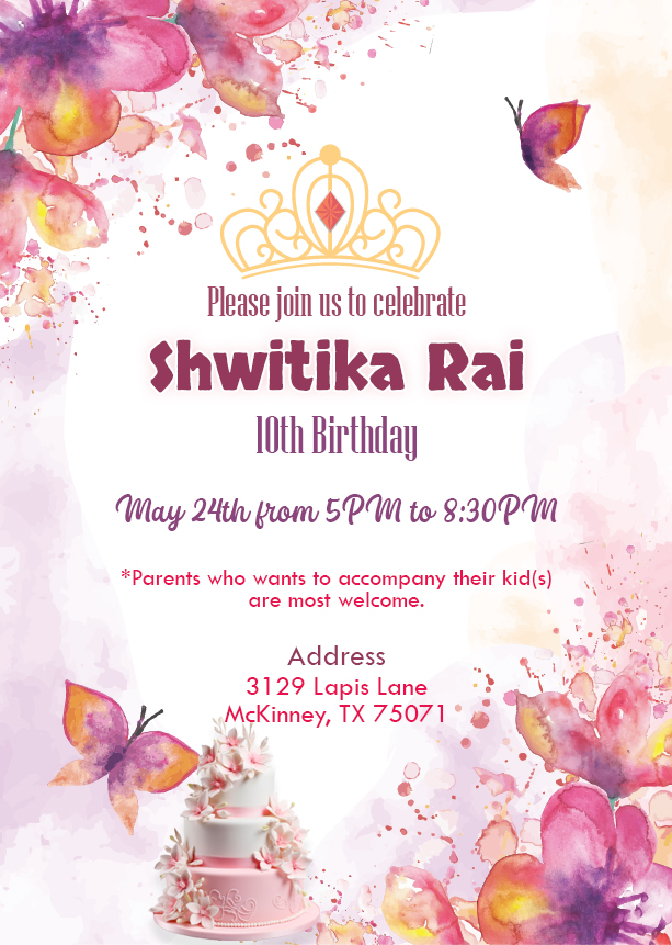 We would be delighted to have you attend Shwitika Rai’s 10th Birthday party on 24th May 2025.